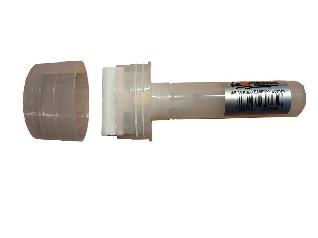 50 mm chisel tip pump marker. Precise and clean, the marker is composed of a refillable empty body with mixing ball and the tip is replacable. It's the ultimate tool for calligraphy on wall and paper.