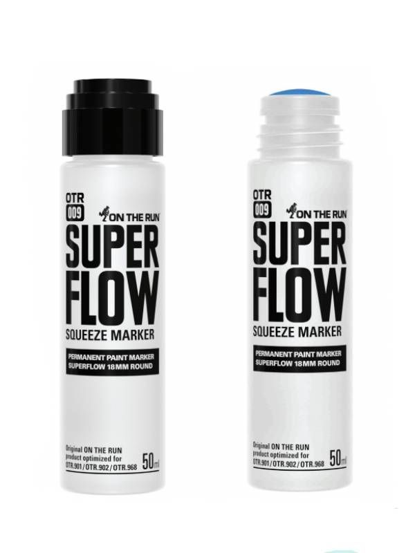 The OTR.009 Superflow is a pocket-sized high flow squeezable marker - equipped with a 18mm durable, high quality nylon mop tip, and works best with On The Run's inks or paints, but also works with any On The Run Paint or Ink, or many other oil, water-based paints, glue, etcetera.