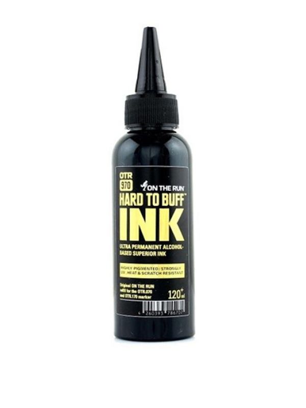 OTR.970 is ultra permanent alcohol-based superior ink. This legendary ink is the nightmare of cleaning crews. Optimized for the OTR.070 & OTR.071 Hard to Buff Marker and the ON THE RUN Soultip™ squeeze markers, but can be used in any mop, squeezer or pump action valve marker.